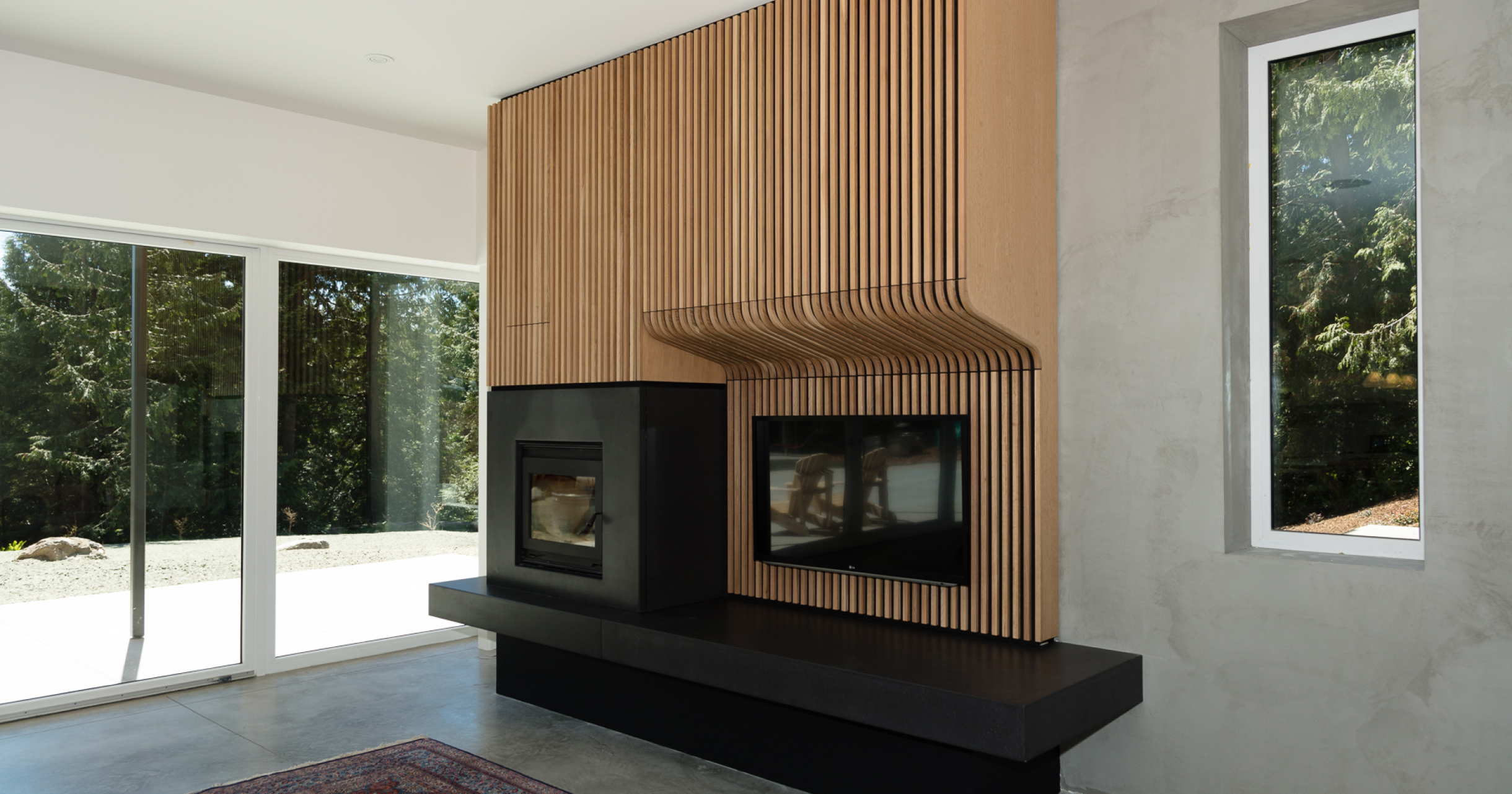 Built with high-performance Passive House principles, the home faces south for winter solar gain, while a large overhang provides summer shade to keep it cool. Thick, insulated concrete walls and floors regulate temperature year-round and a Zehnder HRV system ensures continuous fresh air for occupants. To further round out energy efficiency, LED lighting, a heat pump dryer, and Energy Star appliances are used throughout the space. The home also features an 11-kilowatt solar system that feeds electricity back to the grid, reducing operating costs, and a 9,500-liter rainwater collection system to support toilet flushing, plant watering, and car washing. In a final green flourish of design, an electric car charger ensures that sustainability extends beyond the home itself.