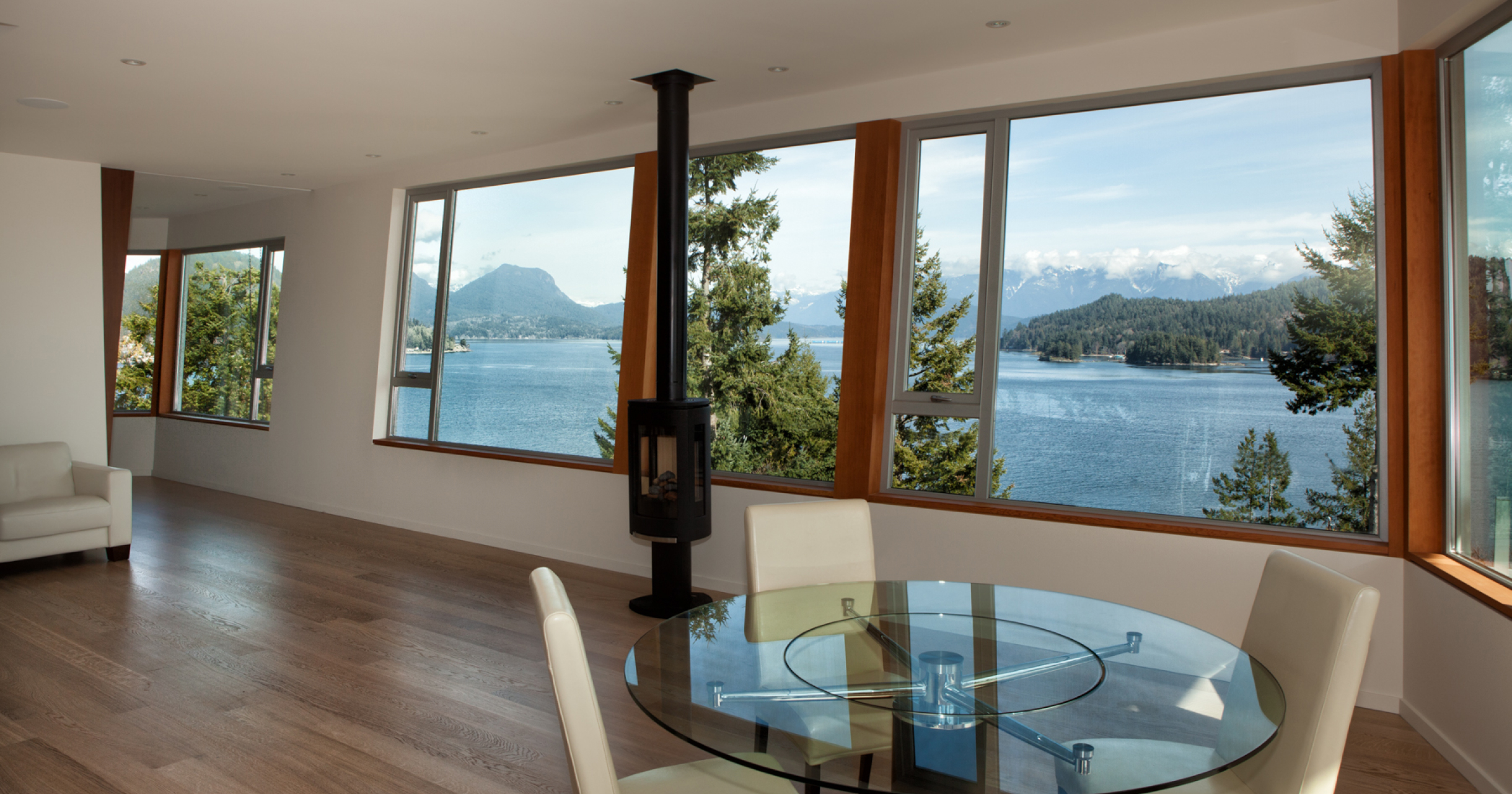 Situated on a rocky outcrop with wraparound views of Howe Sound and the Strait of Georgia, this LEED Gold residence blends sustainable design with sheer elegance. Some highlights include a glass-enclosed hydraulic lift connecting the upper and lower levels, extra wide sliding doors, and showers designed without any barriers at the floor. The home also features continuous insulation, solar hot water, and a heat recovery ventilation system, with infrastructure ready for future photovoltaic cells and a wind turbine. At once dramatic and inspiring, this home epitomizes luxurious, forward-thinking coastal living.