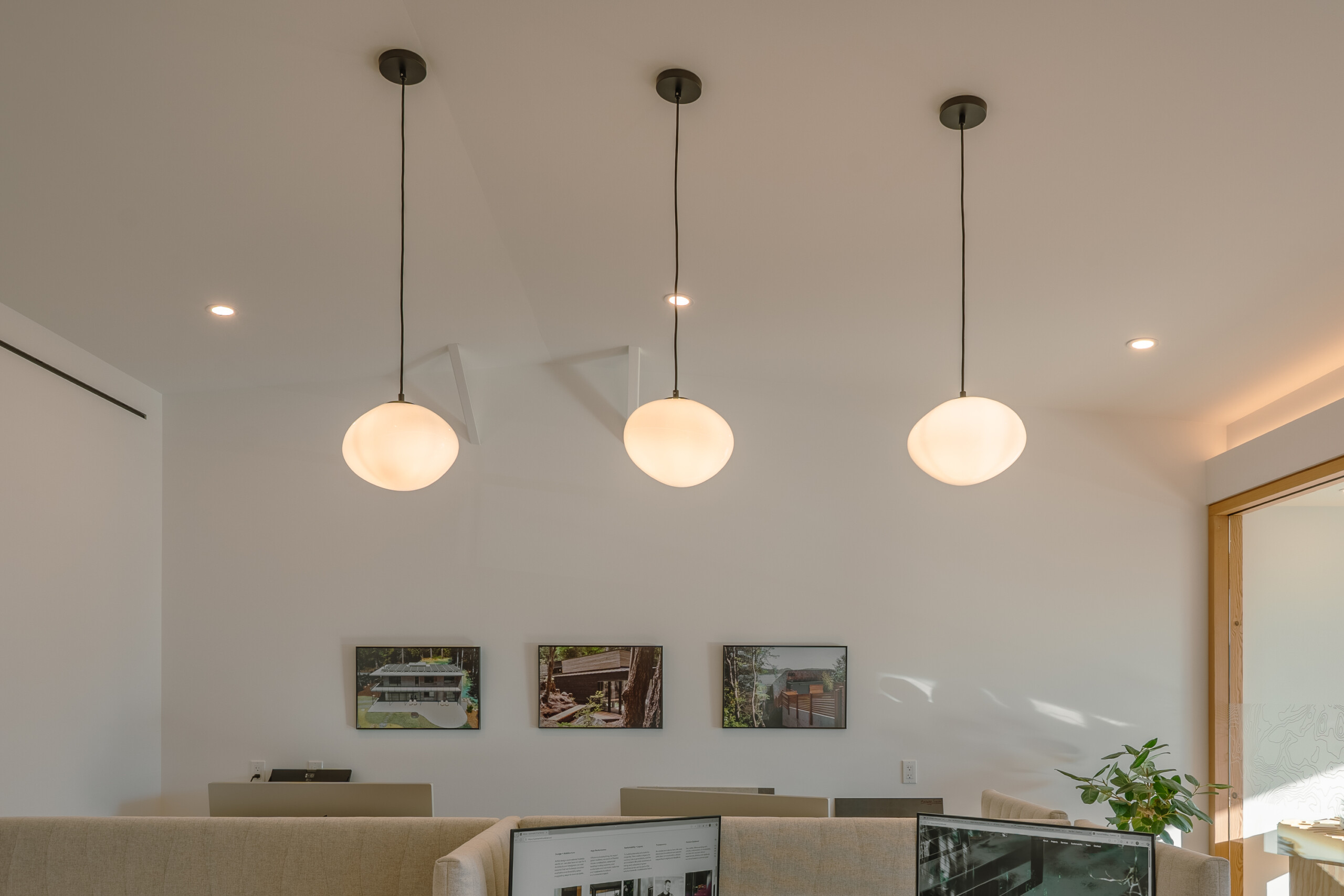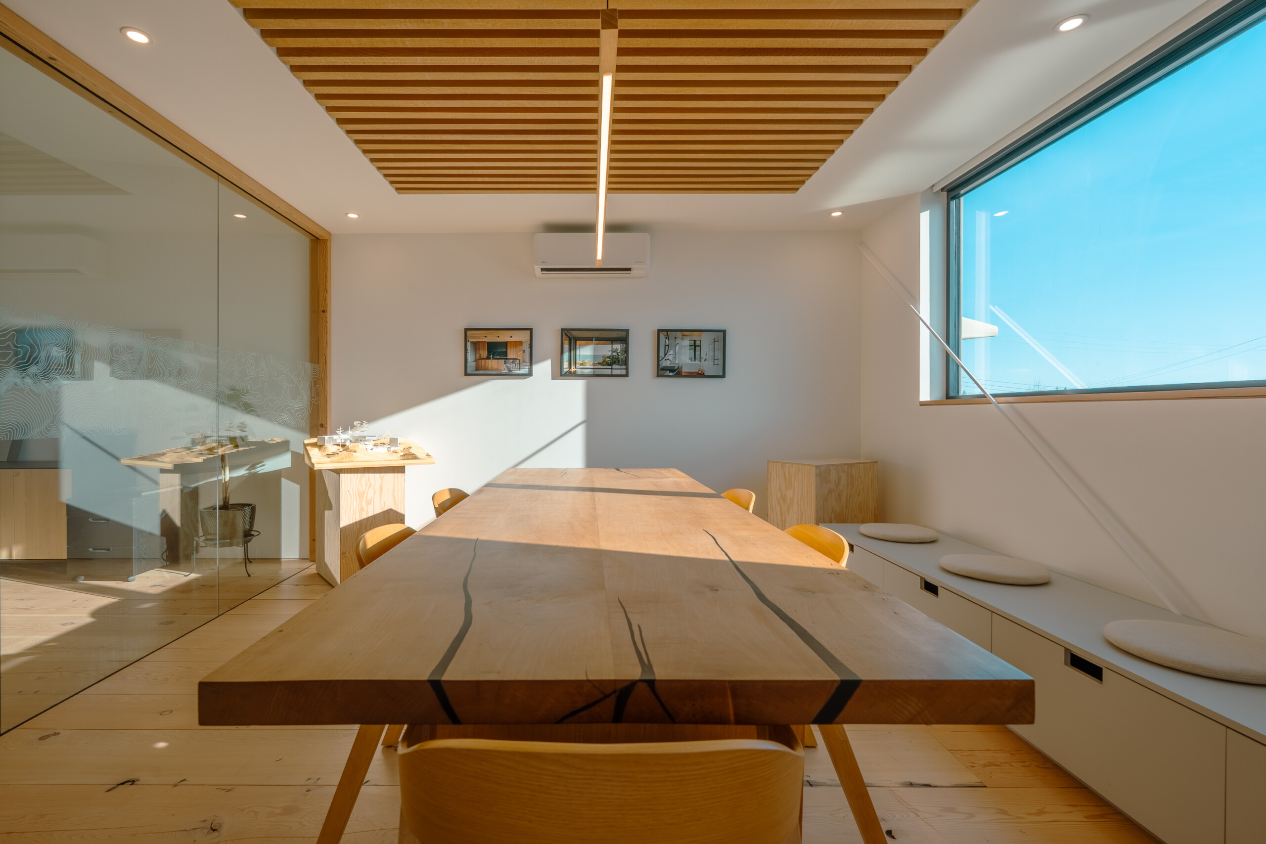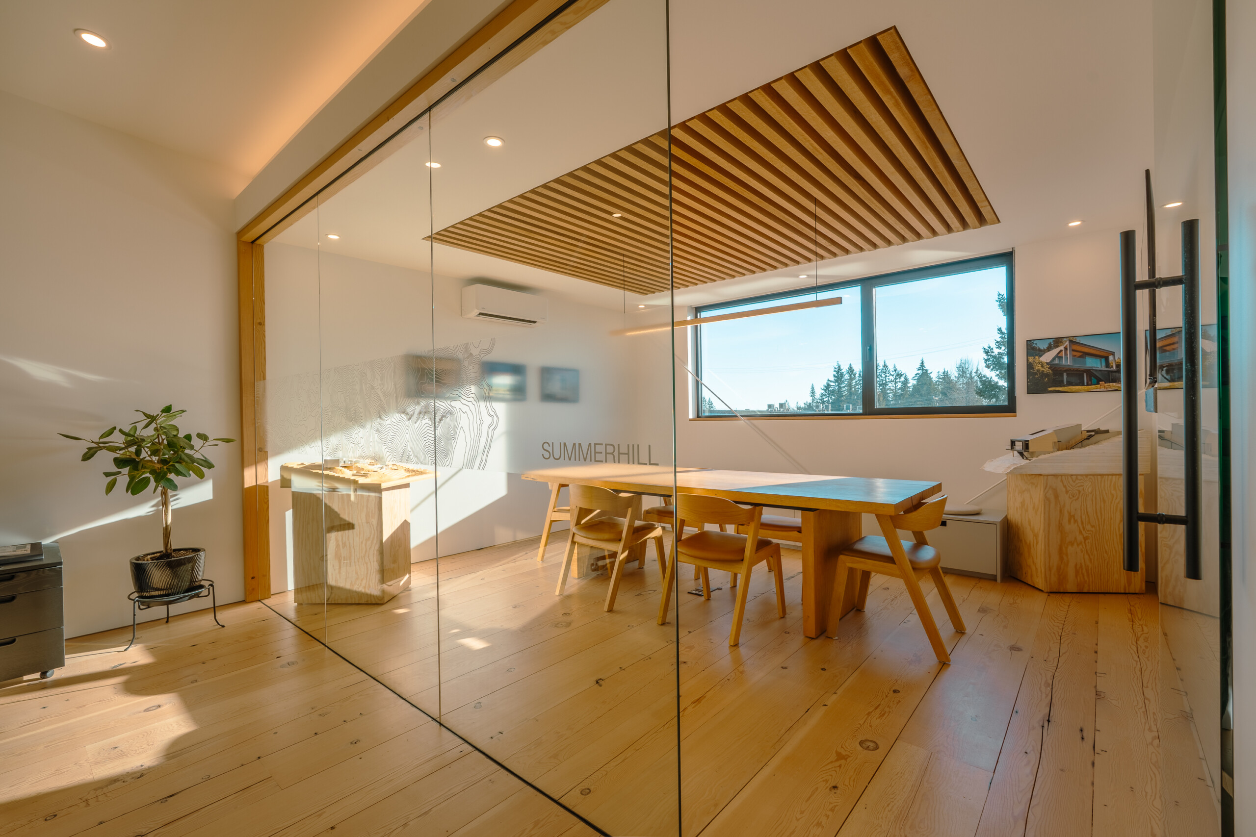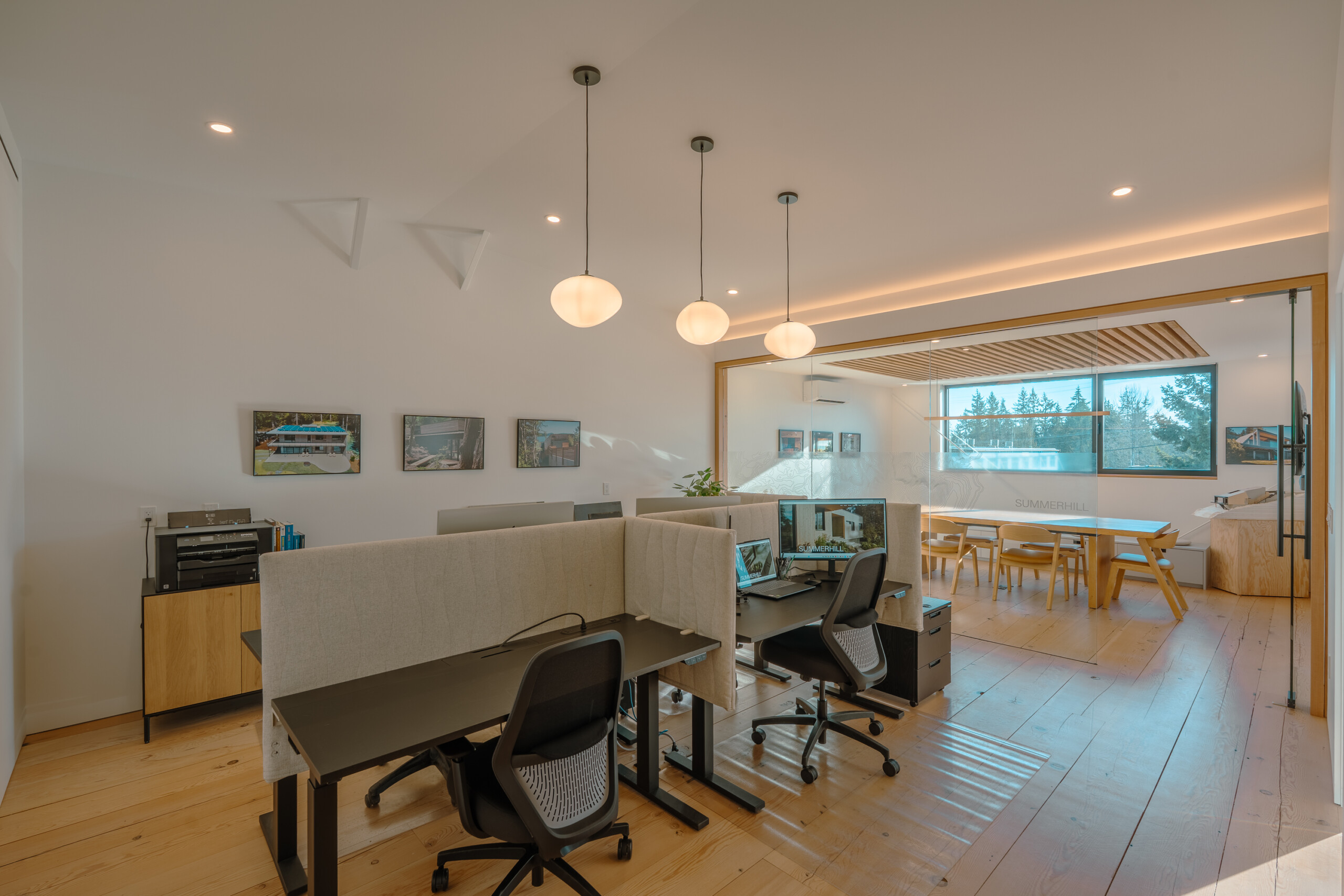 Glass-walled offices pull natural light deep into the plan, creating clear sightlines and a bright, collaborative environment that feels both calm and energized. Carefully detailed millwork, exposed wood elements, and a restrained material palette showcase the craftsmanship and design-forward thinking we bring to every project on BC’s Sunshine Coast and beyond.