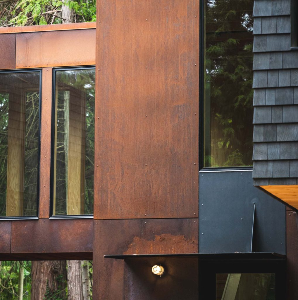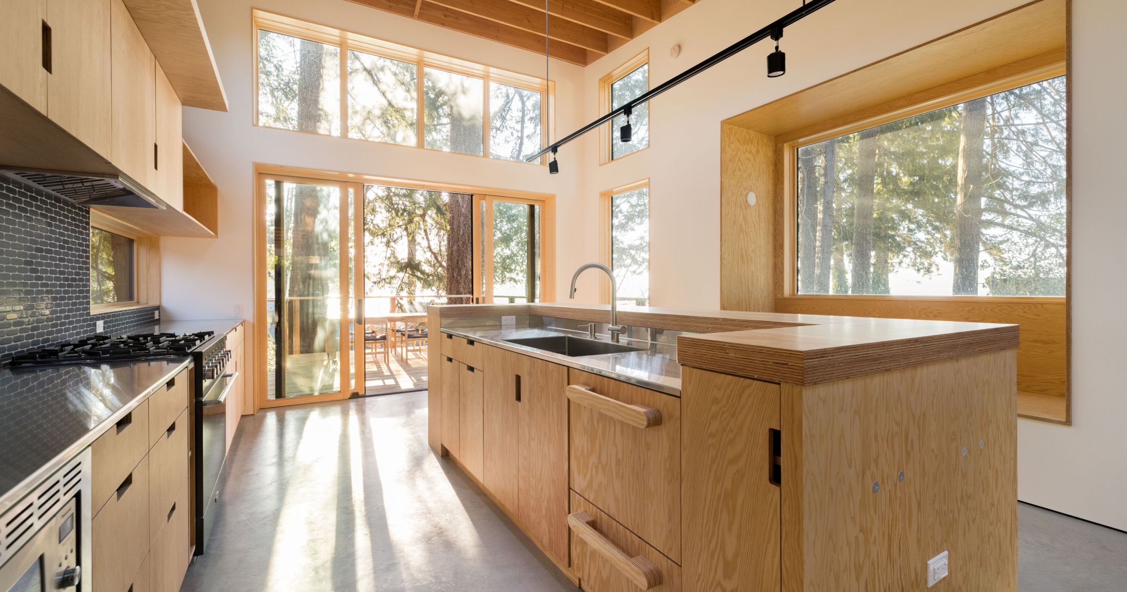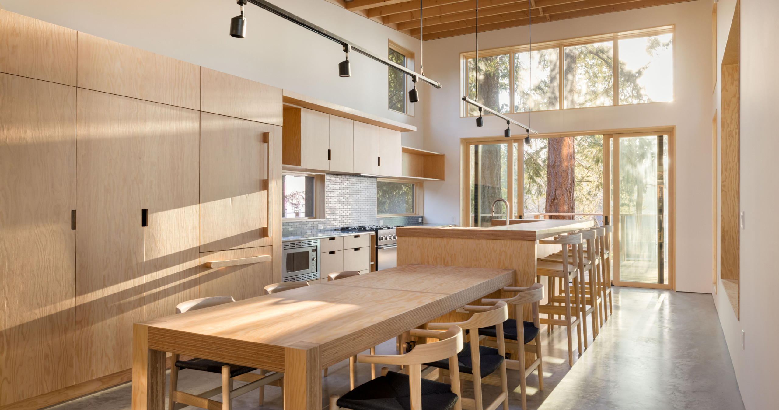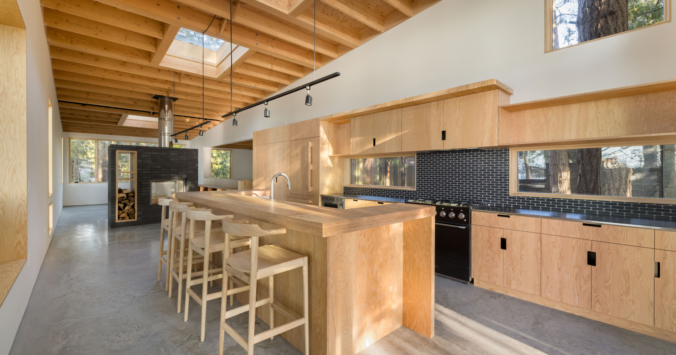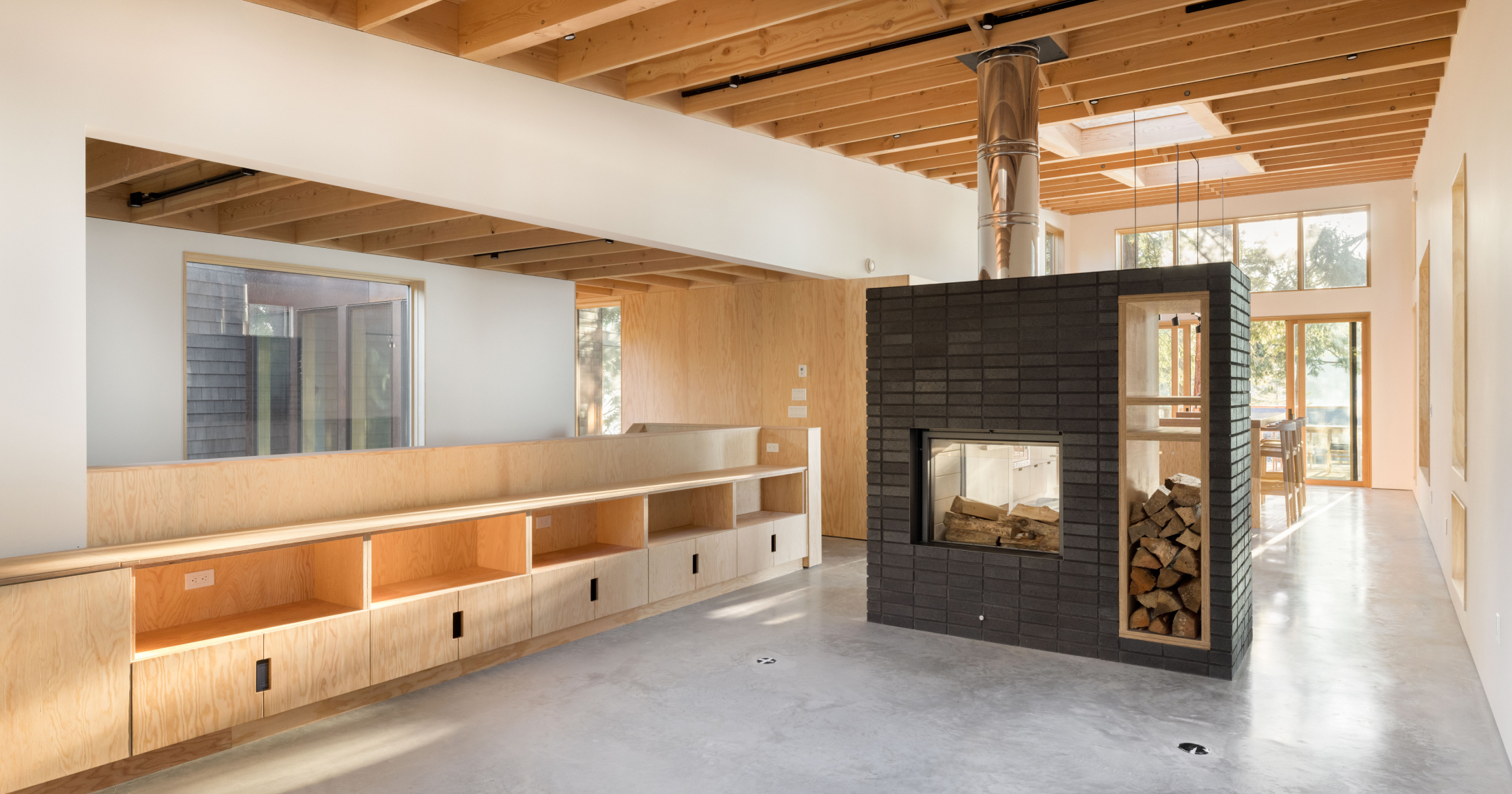 Clad in black-stained cedar shingles and Corten steel, the home’s exterior blends in with the landscape and pays homage to the site’s history as a shingle mill. Inside, exposed ceiling joists, plywood millwork, and a double-sided wood-burning fireplace create a cozy, inviting space.